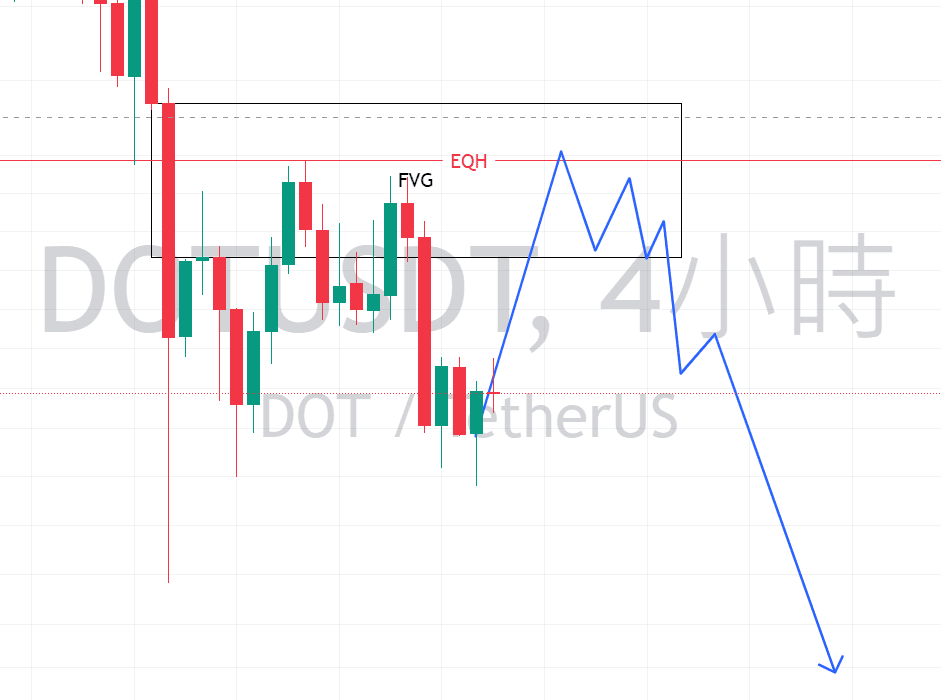 Allo stesso tempo, si verifica una zona di squilibrio a livello di 4 ore, attendere che il prezzo salga per pulire la liquidità, quindi passare a un periodo di tempo più piccolo; se continua a presentarsi una struttura al ribasso, si entra short, posizionando lo stop loss sulla linea superiore della zona di squilibrio e il take profit inizialmente a 5.4.