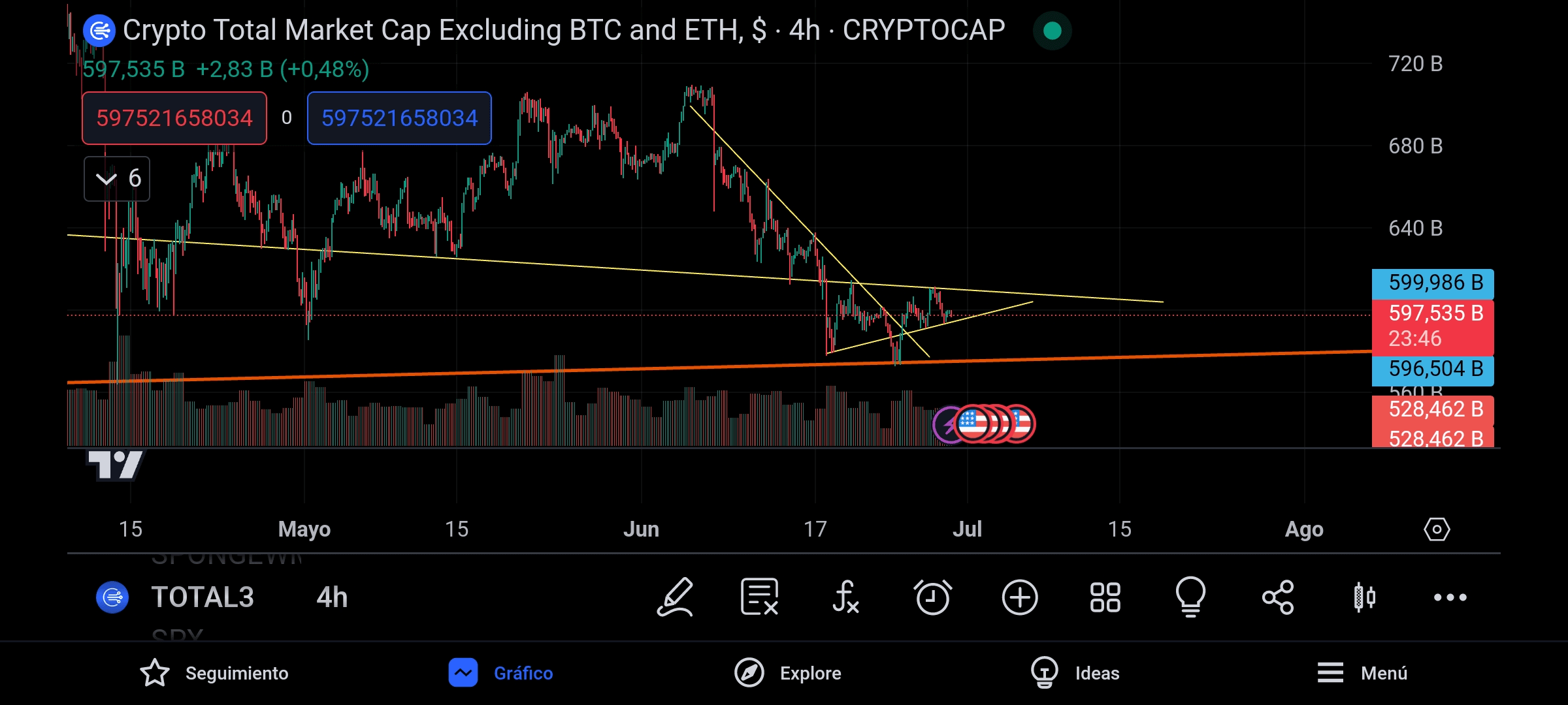 I wreszcie Total3 utrzymał się całkiem nieźle powyżej zakresu 590B, po dotarciu do linii długoterminowego trendu wzrostowego na 573B, mocno odbił się od normy i pozostał stabilny w typowym upartym wzorze proporczyka.
