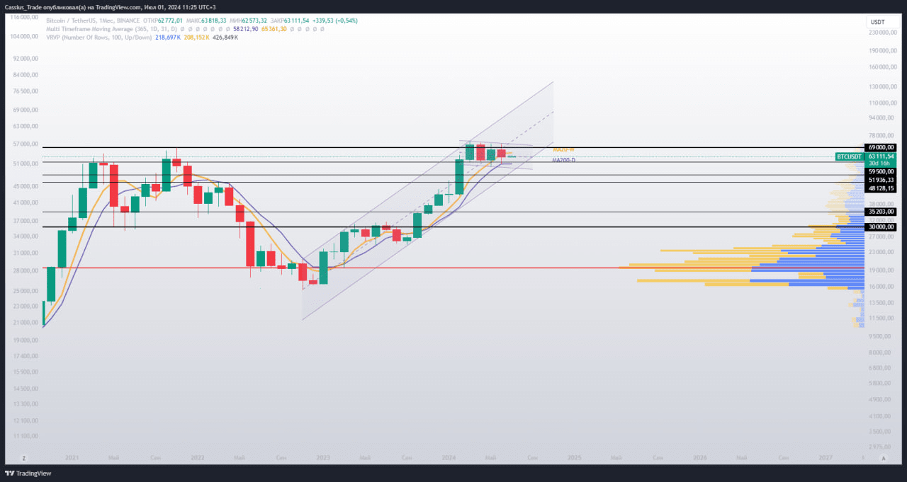 Poniżej mamy istotne wsparcie w postaci dolnej granicy obecnego trendu bocznego, długoterminowej średniej kroczącej MA200d, poziomu 59500 oraz dolnej granicy kanału wzrostowego obecnego trendu zwyżkowego.