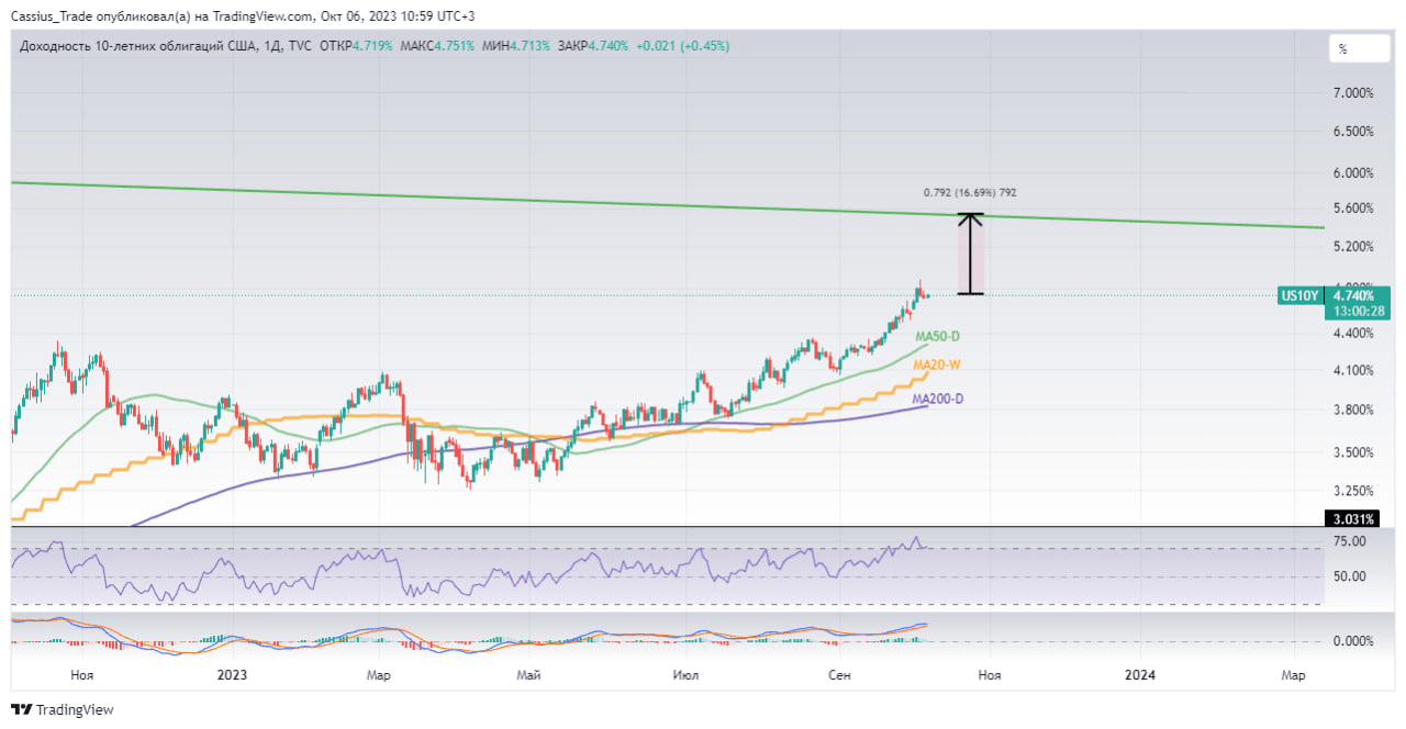 Obecnie rentowność obligacji 10-letnich wynosi 4,74%, a do osiągnięcia poziomu 5,5% pozostało już tylko +17%.