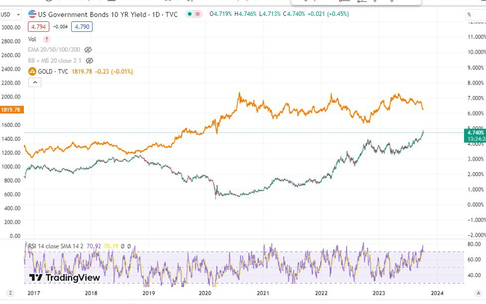 📈 Jak wiadomo, złoto jest bardzo silnie skorelowane z 10-letnimi obligacjami USA.