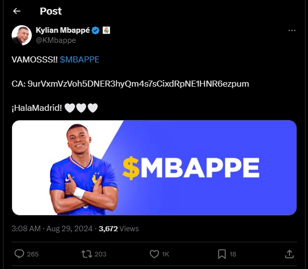 Rano 29 sierpnia (UTC) społeczność kryptowalutowa na platformie społecznościowej X (dawniej Twitter) odkryła niepokojący incydent cyberbezpieczeństwa. Konto gwiazdy futbolu Kyliana Mbappe, szczycące się 14,4 milionami obserwujących, zostało zhakowane i wykorzystane do promowania nowego memecoina o nazwie MBAPPE na platformie Solana.