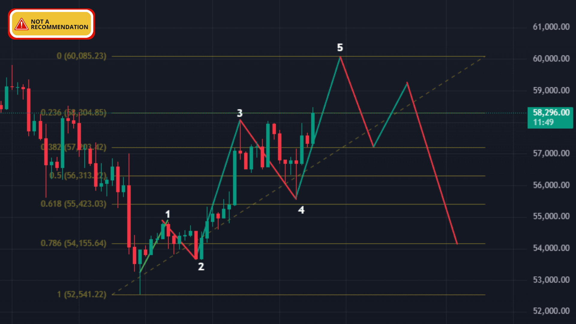 Jak na razie wszystko przebiega zgodnie z planem. Mój krótki stop bezpieczeństwa został uruchomiony po przebiciu szczytu na poziomie 58,100. Teraz powinniśmy znaleźć szczyt fali 5 w przedziale od 59 400 do 61 700. $BTC