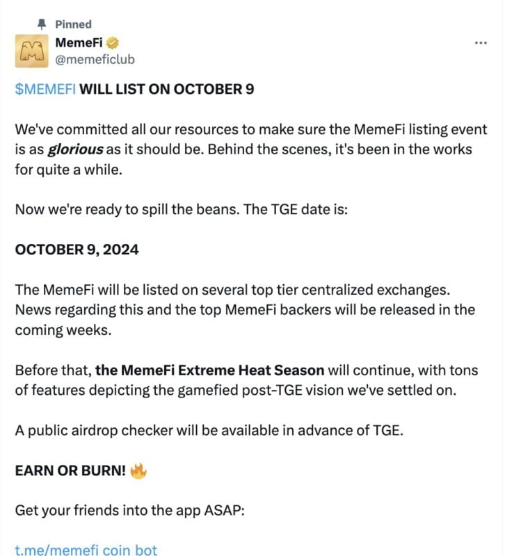 MemeFi oficjalnie ujawniło, że 9 października 2024 r. odbędzie się wydarzenie Token Generation Event (TGE). Monety MemeFi będą notowane na kilku wiodących scentralizowanych giełdach.