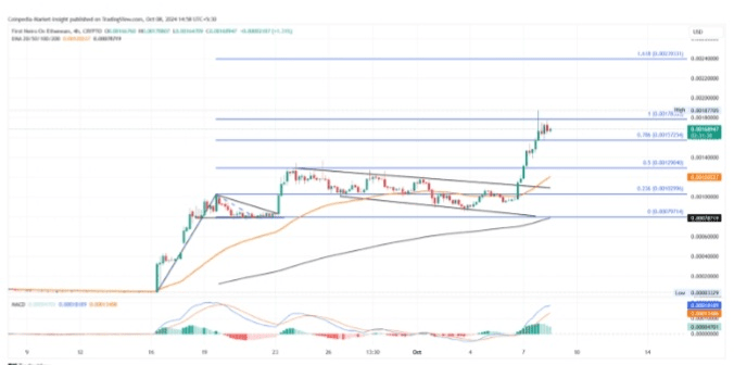 Na wykresie 4-godzinnym pierwszy Neiro na Ethereum ujawnia kontynuację trendu wzrostowego z byczym proporcem i przebiciem spadającego kanału. Obecnie rajd przebicia spadającego kanału testuje poziom oporu 0,0018%, drażniąc potencjalną zmianę boczną.