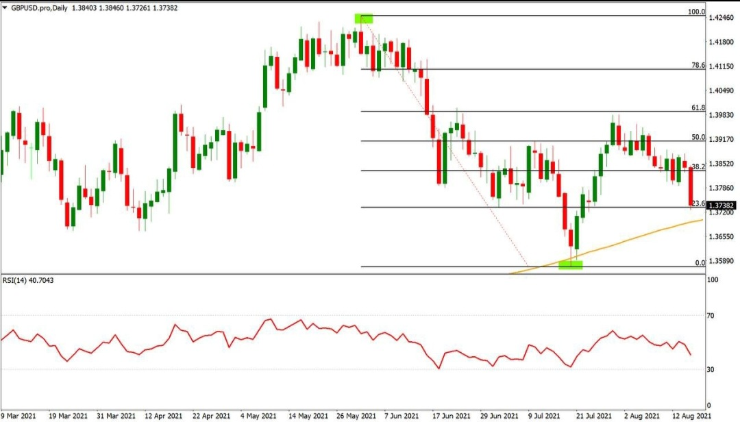 W trendzie spadkowym zniesienie Fibonacciego wykorzystuje następujące współczynniki: 23,6%, 38,2%, 50%, 61,8% i 78,6%.