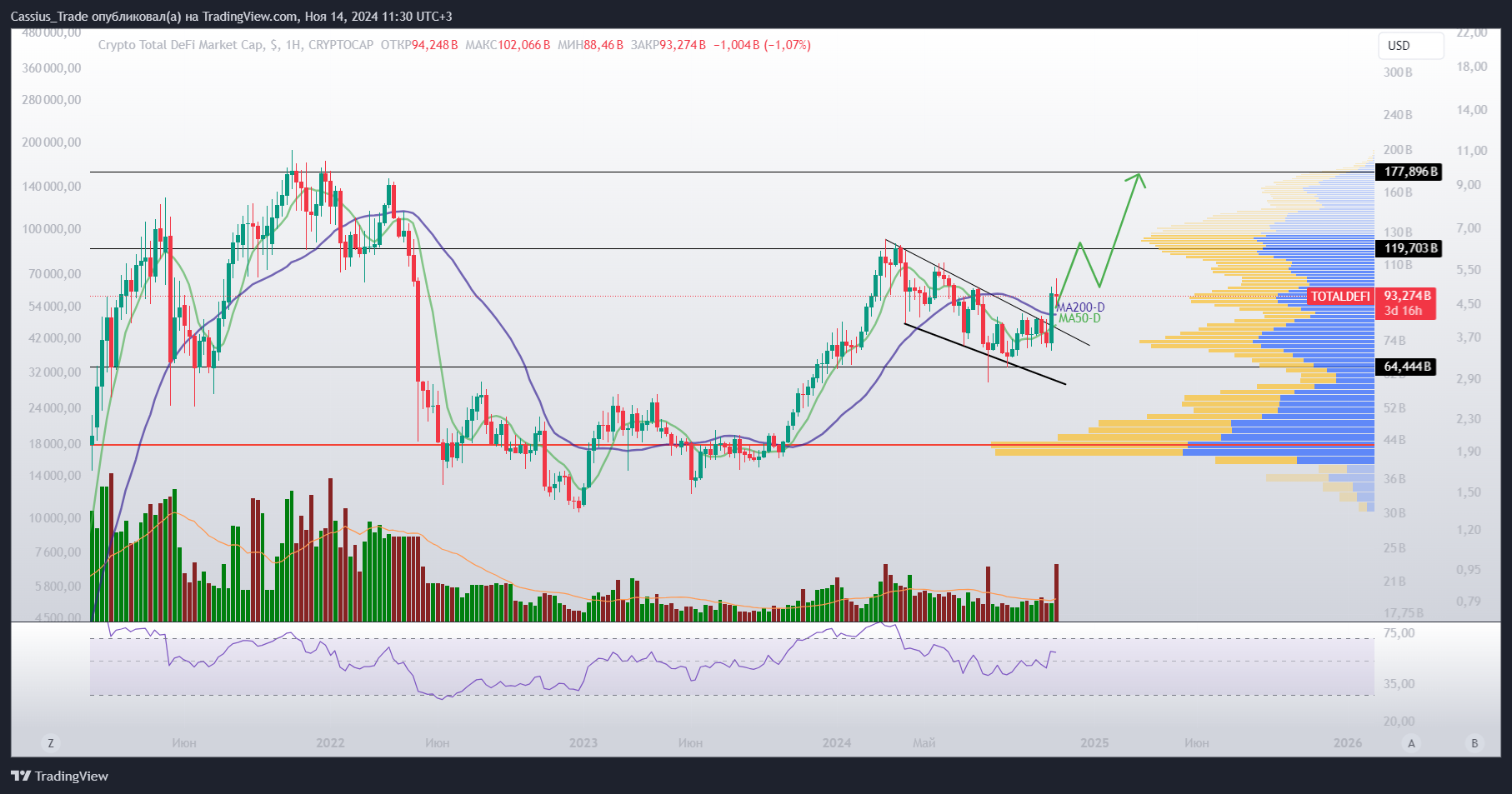 4️⃣ Kapitalizacja wszystkich tarczcoinów przebiła się przez kształt klina i długoterminowo poruszała się w górę, przy dużym wolumenie.