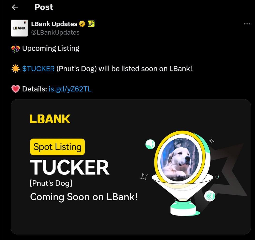 Poruszający nowy uczestnik w przestrzeni monet memowych, $TUCKER oddaje hołd Tuckerowi, lojalnemu psu zmarłego i ukochanego PNUT. Wprowadzony przez Instagram PNUT, Tucker stał się symbolem nadziei i odporności po przedwczesnej śmierci PNUT. W miarę jak świat kryptowalut jednoczy się wokół tej poruszającej narracji, $TUCKER szybko zyskał na znaczeniu, z całkowitą podażą 1 miliarda tokenów, aktualną kapitalizacją rynkową wynoszącą 1,2 miliona dolarów i pierwszym notowaniem CEX, które odbywa się dzisiaj.