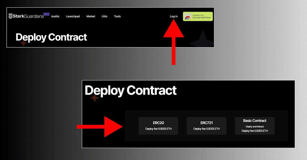 Przejdź na stronę internetową i kliknij „Zaloguj się”, aby połączyć swój portfel: https://alpha.starkguardians.com/deploy