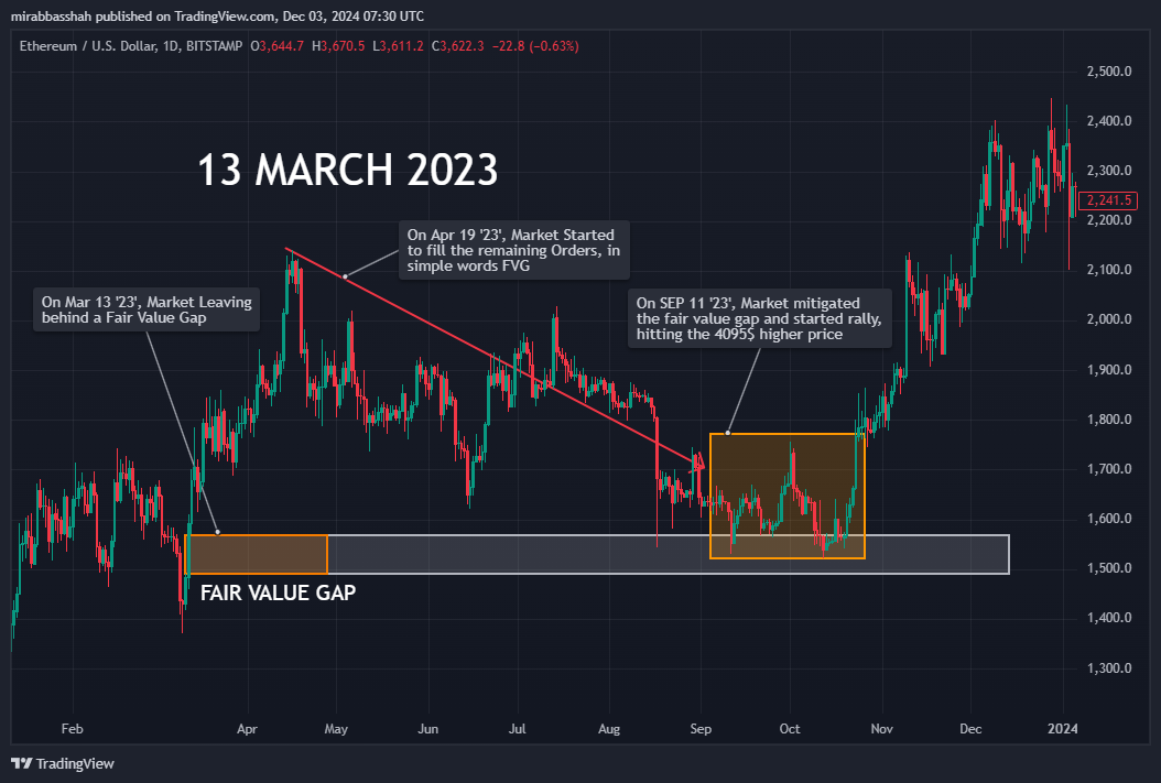 13 marca 2023 roku cena Ethereum spadła szybko, tworząc znaczną lukę FVG poniżej. Do 11 września 2023 roku ETH wrócił, aby wypełnić tę lukę, co umożliwiło późniejszy wzrost w kierunku wyższych poziomów cenowych, przekraczając próg 4 000 dolarów. To wydarzenie historyczne nie było odosobnione. Wzór na cofanie rynku w celu wypełnienia luk i następnego wzrostu był widoczny w wielu przypadkach w różnych ramach czasowych. 📈💥