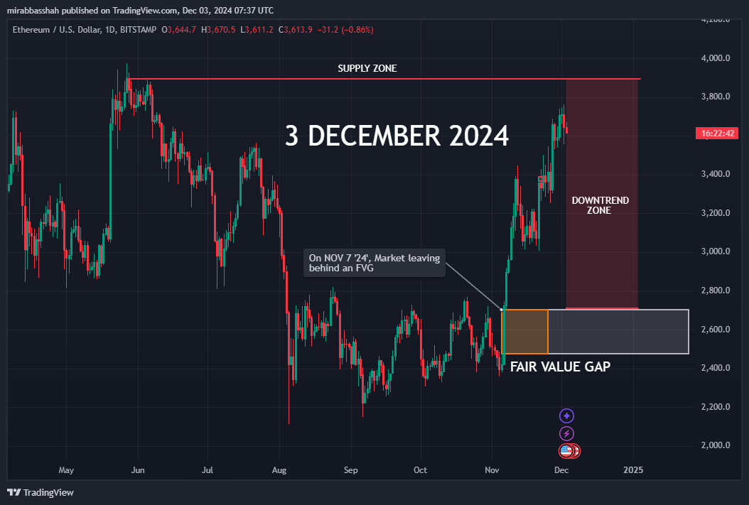 Wykres dzienny jest niezbędny do zrozumienia szerszego kontekstu, w tym obszarów, w których podaż i popyt współdziałają, aby stworzyć kluczowe punkty zwrotne na rynku. Jednym z takich obszarów jest Luka w wartości godziwej (FVG), niewypełniona przestrzeń, którą traderzy obserwują jak sokoły. To główny wskaźnik tego, gdzie rynek może wrócić, aby się zrównoważyć, a wykres Ethereum pozostawił znaczną lukę, która może dyktować następny ruch. ⚠️
