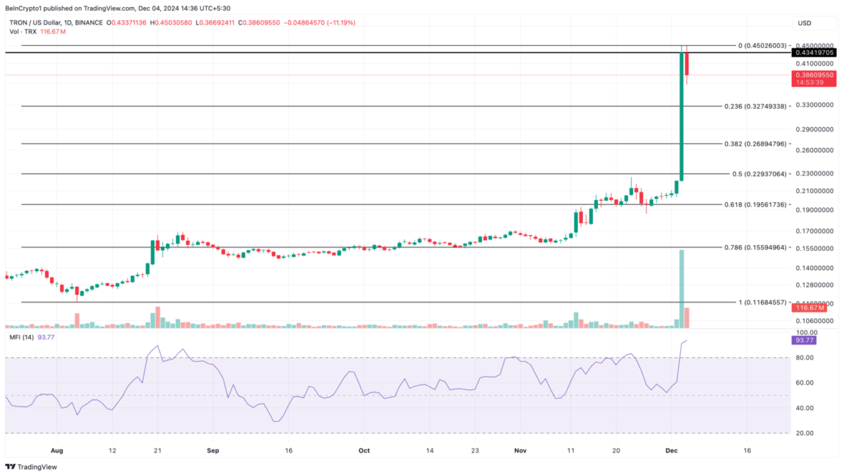 Na dziennym wykresie TRX Tron napotkał opór na poziomie 0,43 dolara, co doprowadziło do cofnięcia do 0,39 dolara. Jednak Indeks Przepływu Pieniędzy (MFI) sugeruje, że to cofnięcie może być tymczasowe.