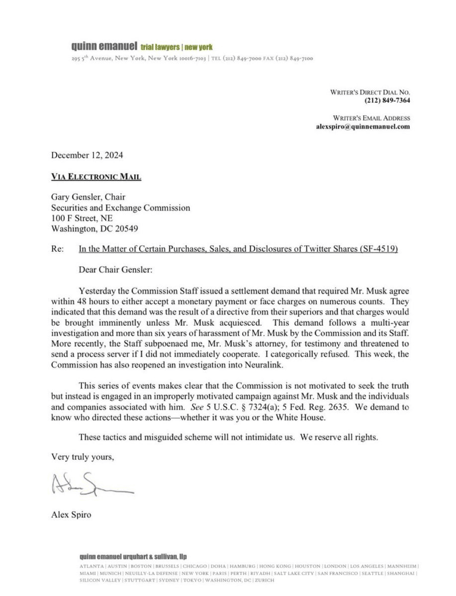 Przewodniczący SEC Gary Gensler wydał ostrzeżenie Elonowi Muskowi, wzywając go do zawarcia ugody w ciągu 48 godzin lub poniesienia nieokreślonych zarzutów. SEC podobno przygotowuje wiele oskarżeń, ale dokładne szczegóły, takie jak charakter zarzutów lub liczba zaangażowanych firm Muska, pozostają niejasne.