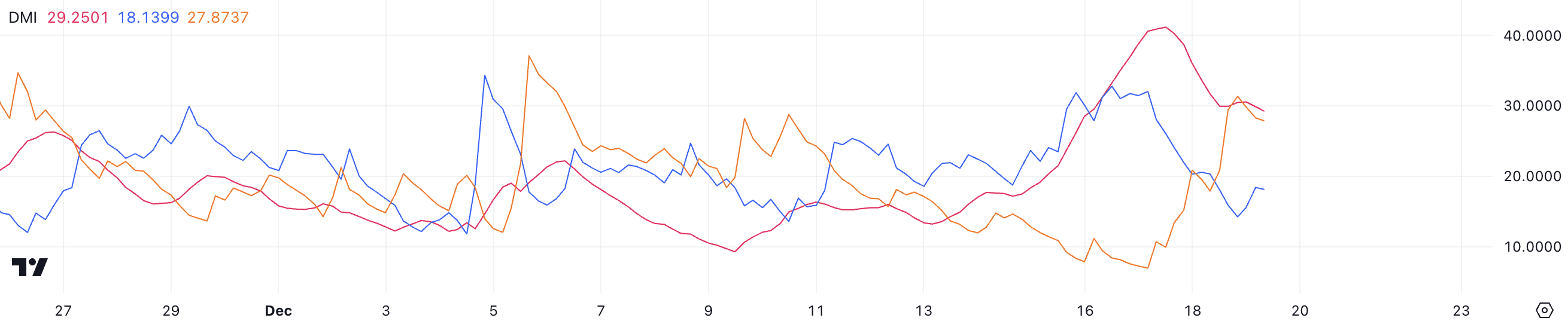 ADX (średni wskaźnik kierunku) mierzy siłę trendu, przy wartościach powyżej 25 wskazujących na silny trend, a poniżej 20 wskazujących na słaby lub nieruchomy rynek. Obecnie D+ dla BTC wynosi 18,1, a D- wynosi 27,8, co wskazuje, że siły spadkowe dominują, a sprzedający przeważają nad kupującymi w krótkim okresie.