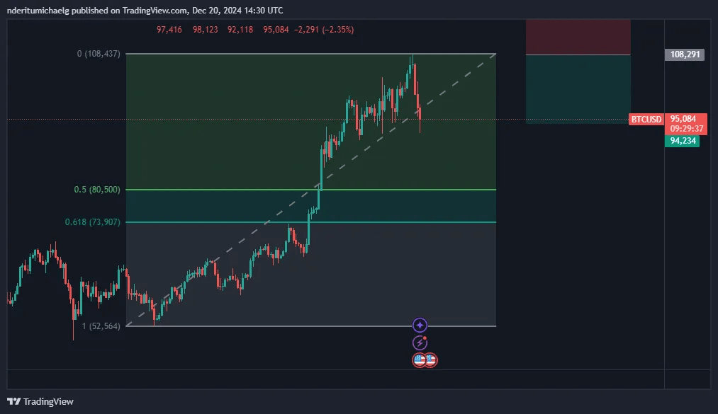 Zniesienie Fibonacciego od początku do końca zwyżkowej fali w IV kwartale sugeruje, że akumulacja może powrócić do poziomu pomiędzy 73 907 a 80 500 dolarów.