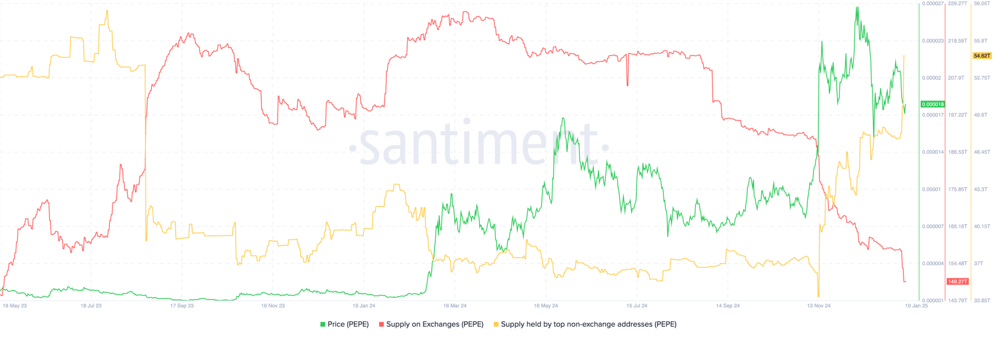Dane on-chain dostarczają wglądu w aktywność w sieci Pepe Coin i wskazują na potencjał odbicia. Jednym z kluczowych wskaźników jest spadek podaży tokenów na giełdach, co pokazuje, że inwestorzy wolą trzymać swoje tokeny w prywatnych portfelach, niż je sprzedawać.
