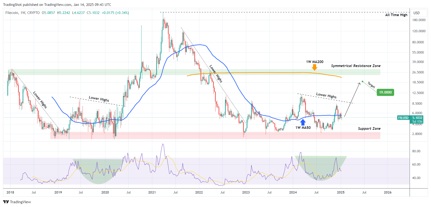Filecoin (FILUSD) konsoliduje się wokół swojego 1W MA50 (niebieska linia trendu) przez ostatnie 4 tygodnie i wydaje się być na końcu wzoru Niższych Szczytów podobnego do tego z lat 2019/20.