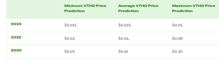Do 2030 r. VTHO prawdopodobnie skorzysta na długoterminowej integracji branży i powszechnej akceptacji technologii blockchain. Jako dojrzały token ekosystemu, cena może wynosić średnio 0,10 USD, przy korzystnych scenariuszach adopcji, które mogą wynieść 0,20 USD, chociaż scenariusze minimalnego wzrostu mogą utrzymać ją na poziomie około 0,05 USD.