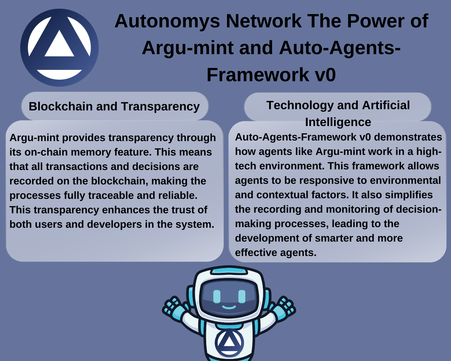 Argu-mint i Auto-Agents-Framework v0 odgrywają ważne role w ogólnym obrazie Sieci Autonomicznych. Argu-mint zapewnia, że procesy podejmowania decyzji są przejrzyste i możliwe do śledzenia, podczas gdy Auto-Agents-Framework v0 dostarcza niezbędną infrastrukturę do skutecznego rozwoju i zarządzania tymi agentami.