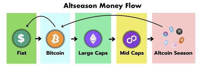 To jest etap, w którym dominacja BTC spada, a kapitał zaczyna płynąć do altcoinów o niskiej kapitalizacji.
