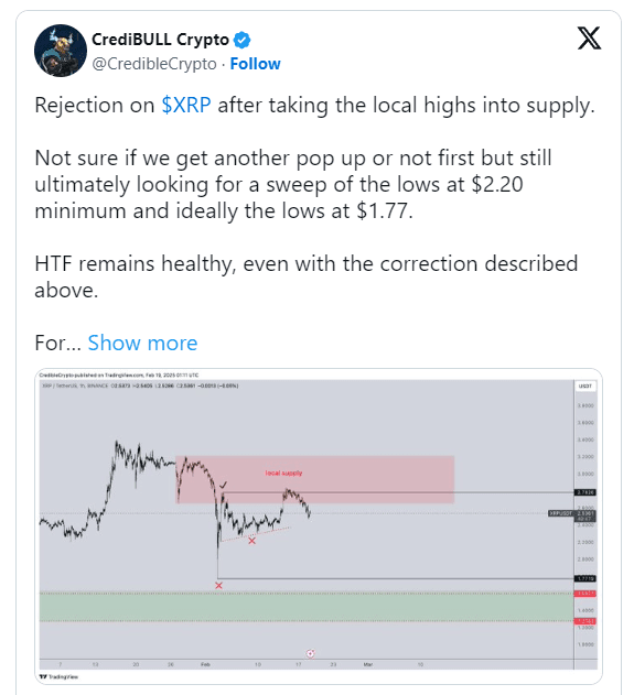 Analityk kryptowalut zauważył, że cena $XRP może spaść do 2,2 USD, a potencjalnie nawet do 1,77 USD, zwłaszcza jeśli niedźwiedzie utrzymają przewagę. Mimo to ogólne perspektywy dla XRP pozostają optymistyczne.