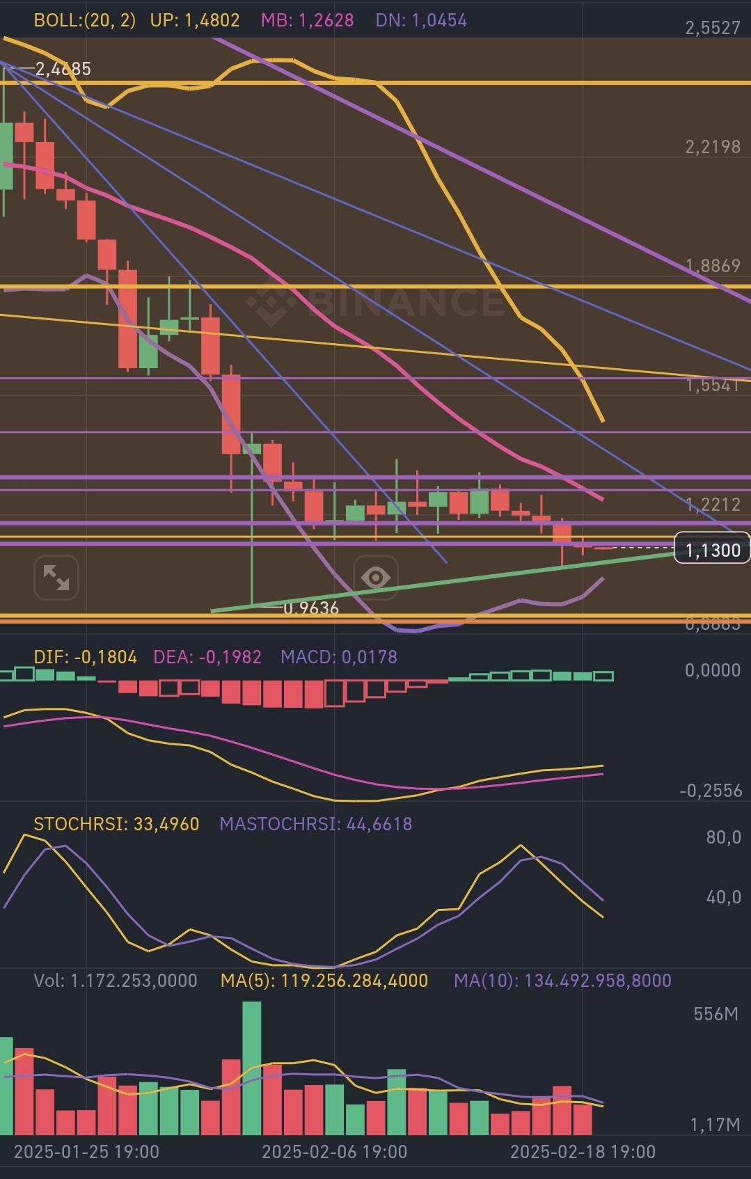 Wniosek: Cena znajduje się blisko dolnej granicy, co wskazuje na presję kupna, jeśli trend spadkowy straci na sile.