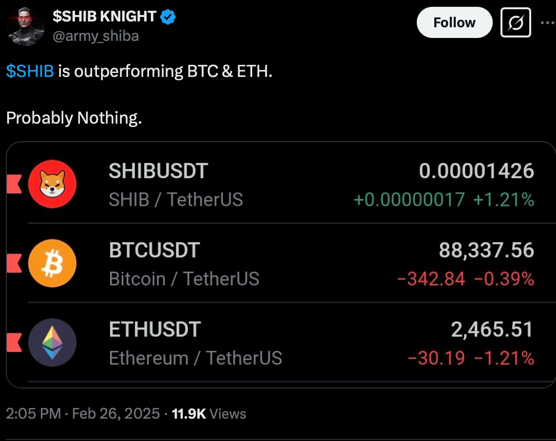 Ciekawie, że SHIB przewyższył Bitcoin i Ethereum, które doświadczyły znacznych spadków z powodu obaw o nowe taryfy wprowadzone przez Donalda Trumpa. Tymczasem tokeny memiczne zbudowane na Ethereum pozostały odporne.