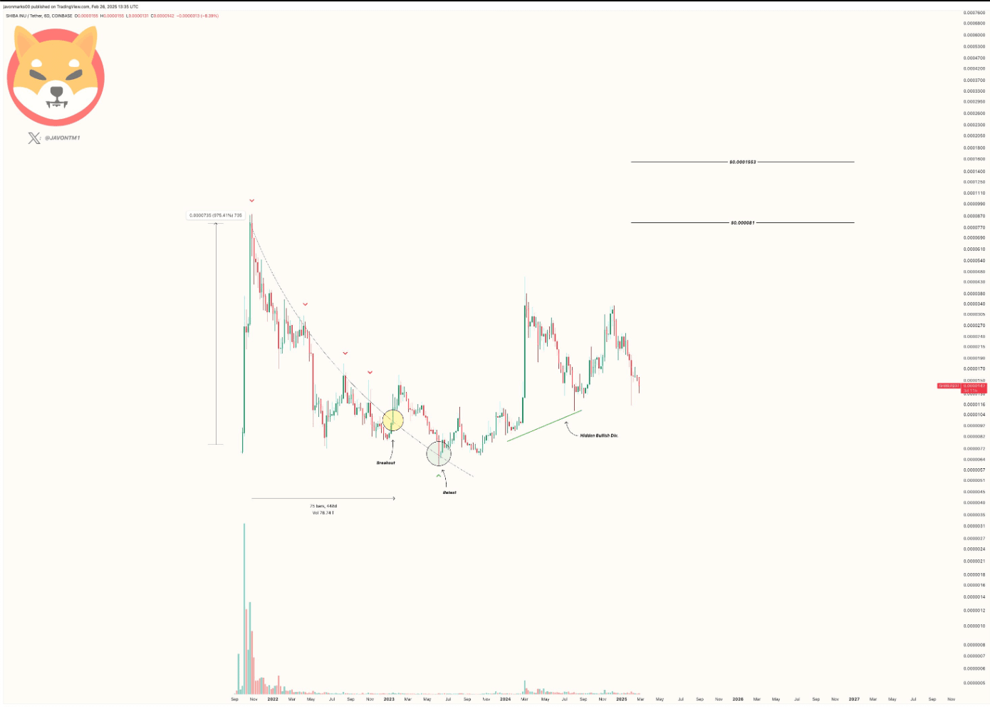 🔍 Analityk kryptowalut Javon Marks podkreślił, że SHIB wciąż utrzymuje kluczowy poziom przełamania z końca 2022/r. 2023. Na podstawie historycznych trendów prognozuje wzrost o 450%, przewidując, że SHIB osiągnie $0.000081.