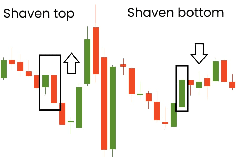 Jeśli świeca nie ma górnego cienia, handlowcy nazywają ją "ogoloną głową". Zwykle pokazuje, że presje spadkowe dominują na rynku. Alternatywnie, świeca bez dolnego cienia nazywana jest "ogoloną podstawą". Ten typ świecy pokazuje, że kupujący dominują na rynku. Sprawdź ✅ ten wykres świec poniżej 👇