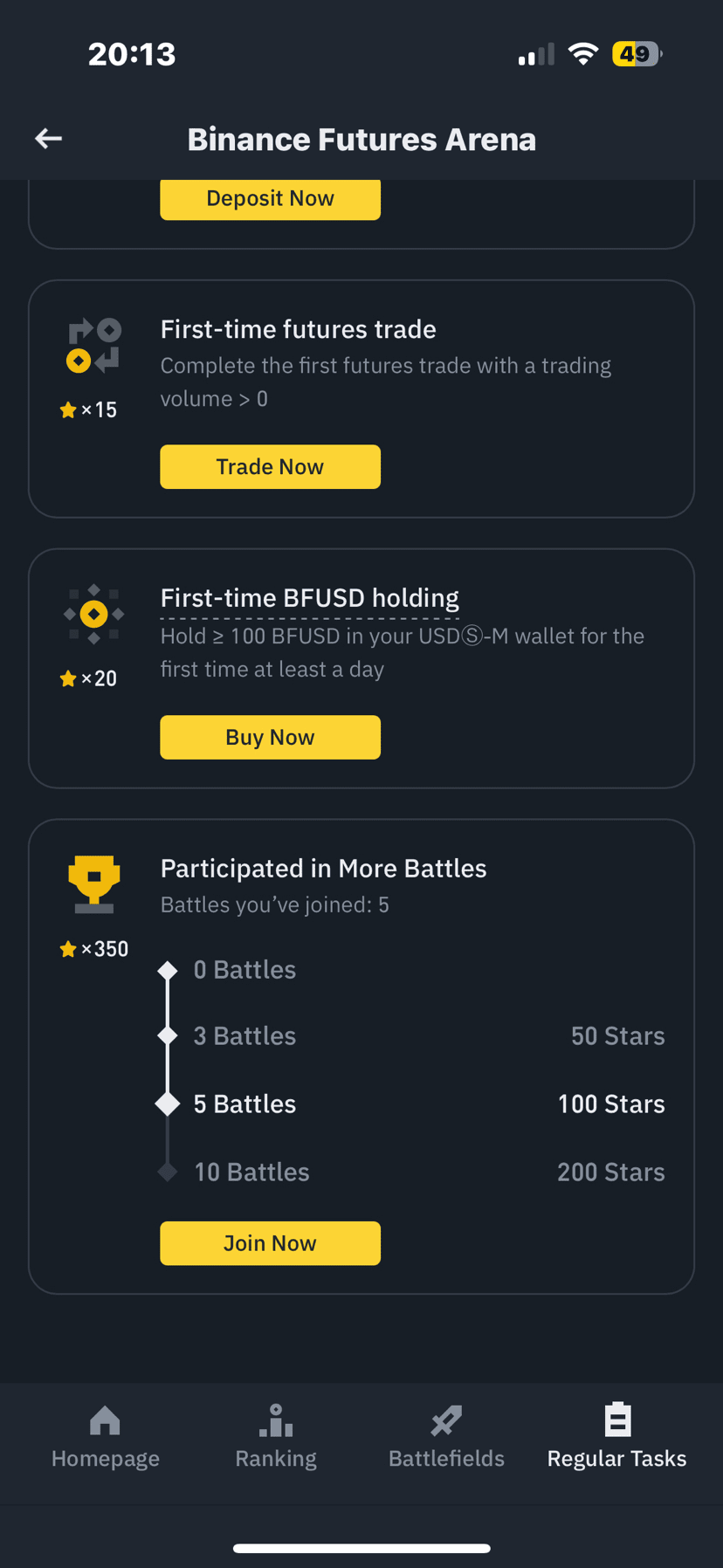 Dołącz do większej liczby bitew: Uczestnicz w 3, 5 lub 10 bitwach i zdobądź 50–200 gwiazd.