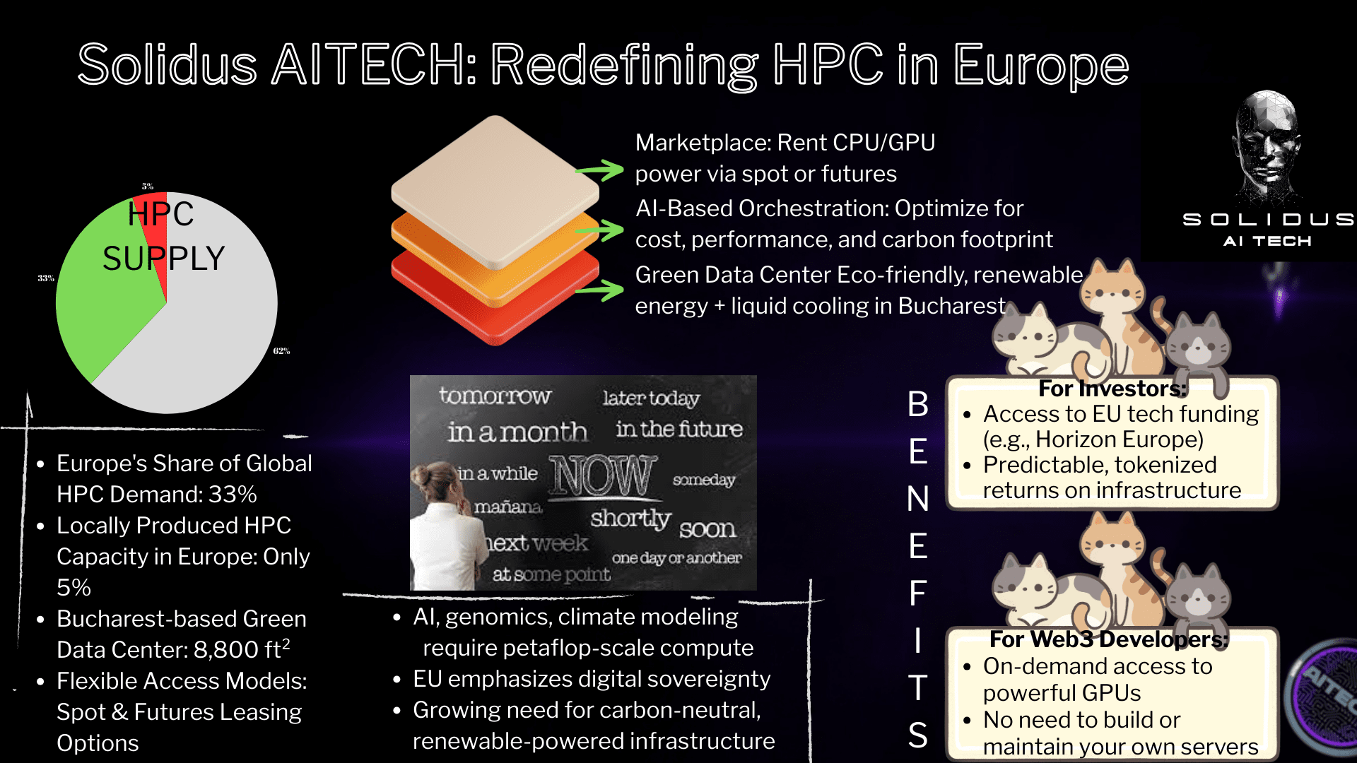 Poprzez konsolidację europejskiej mocy obliczeniowej HPC z zieloną, blockchainową architekturą i orkiestracją napędzaną przez AI, Solidus AITECH wzmocni cyfrową suwerenność i otworzy nowe możliwości dla ekosystemu kryptowalut. Ta wizja stanowi długoterminową inwestycję w cyfrową przyszłość kontynentu.