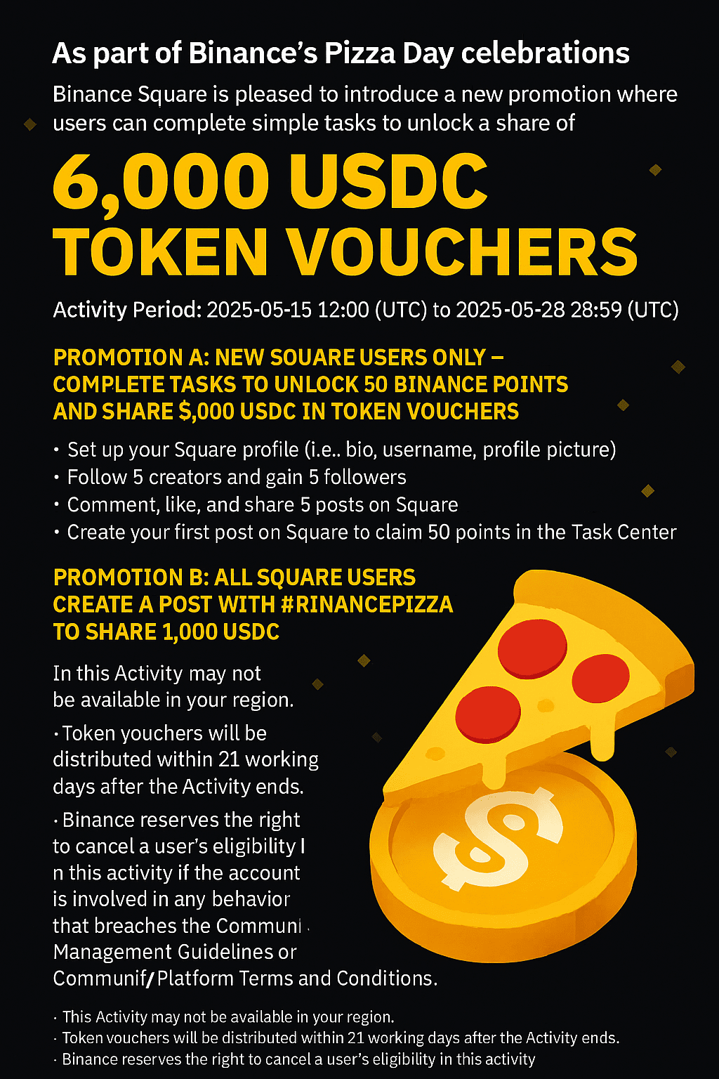 W ramach obchodów Dnia Pizzy Binance, Binance Square z przyjemnością wprowadza nową promocję, w której użytkownicy mogą wykonać proste zadania, aby odblokować część 6 000 USDC w kuponach tokenowych.
