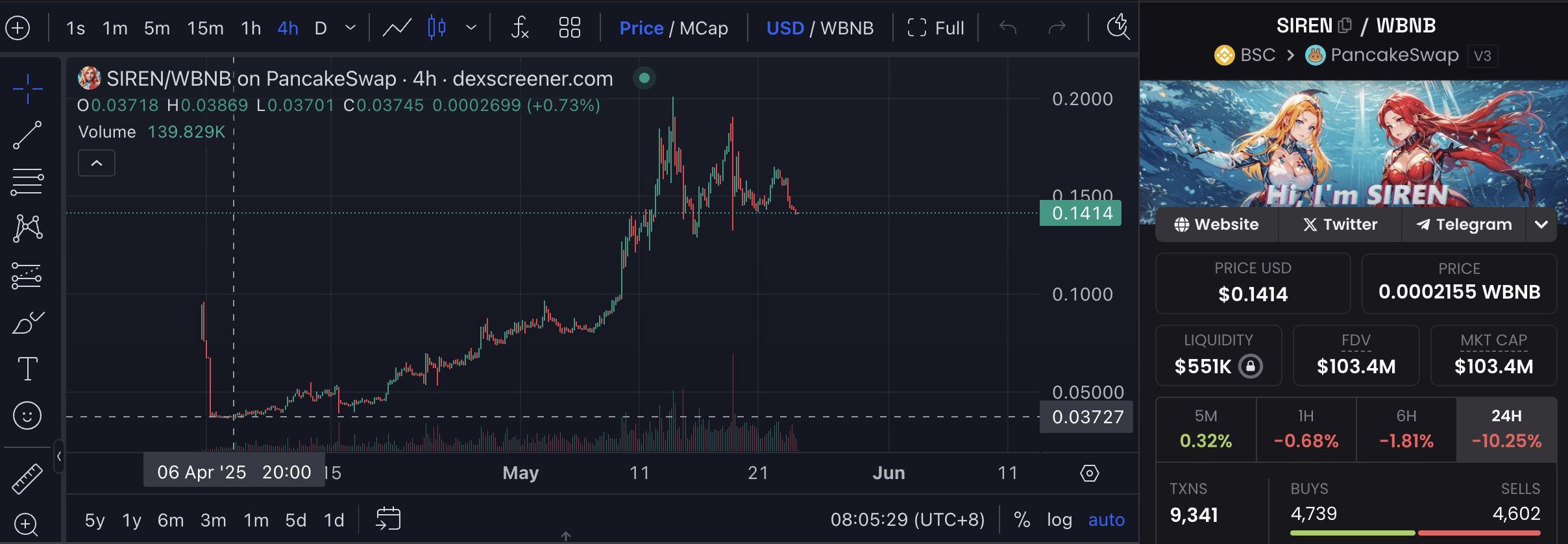 22 lutego 2025 roku, SIREN osiągnął 13,16 miliona dolarów dziennego wolumenu transakcji, stając się zwycięzcą oficjalnego programu płynności Meme BNB Chain i otrzymując 200 000 dolarów płynności. To nie tylko zwiększyło głębokość rynku, ale także obniżyło próg transakcji dla nowicjuszy.