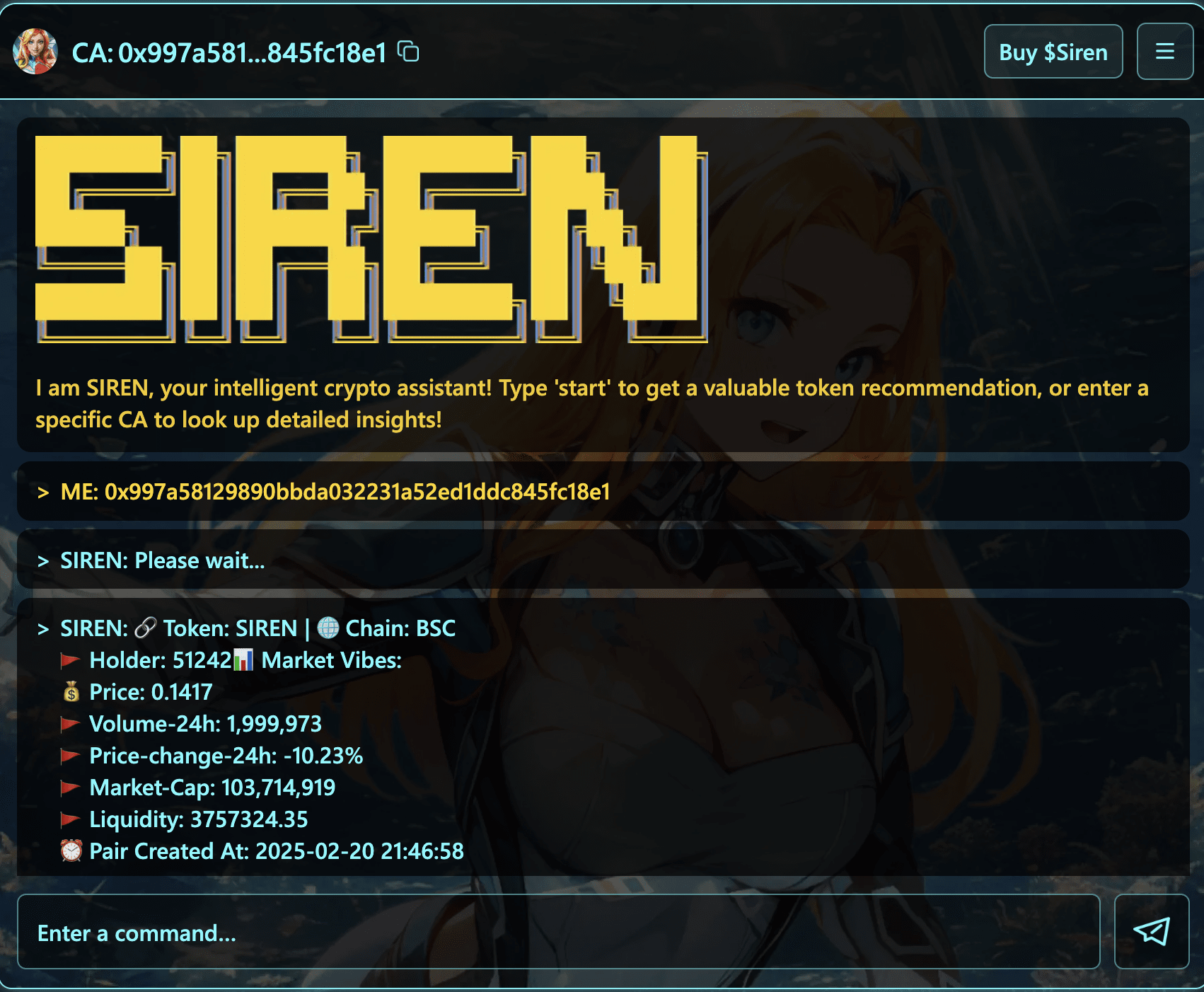 Dzięki prostym poleceniom użytkownicy mogą uzyskać listę rekomendowanych tokenów od Siren, a wprowadzenie adresu kontraktu tokena pozwala na uzyskanie szczegółowych informacji, takich jak adresy posiadaczy, dynamika KOL-ów oraz wskaźniki on-chain. Konto na Twitterze jest również zarządzane automatycznie przez AI, regularnie publikując starannie wybrane tokeny.