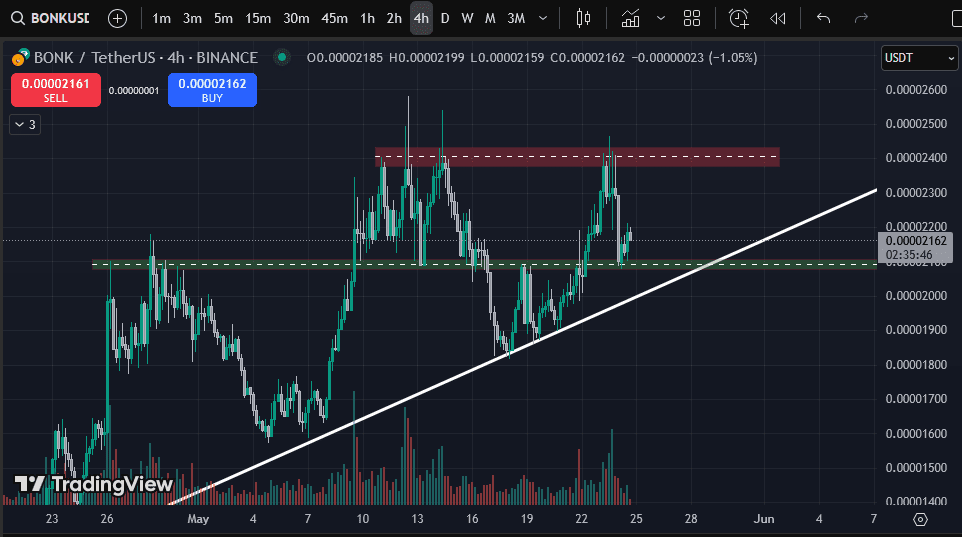 BONK agresywnie wzrastał od połowy maja, napotykając opór w pobliżu $0.0000245 przed ostrym odrzuceniem. Teraz cofa się w kierunku wsparcia.