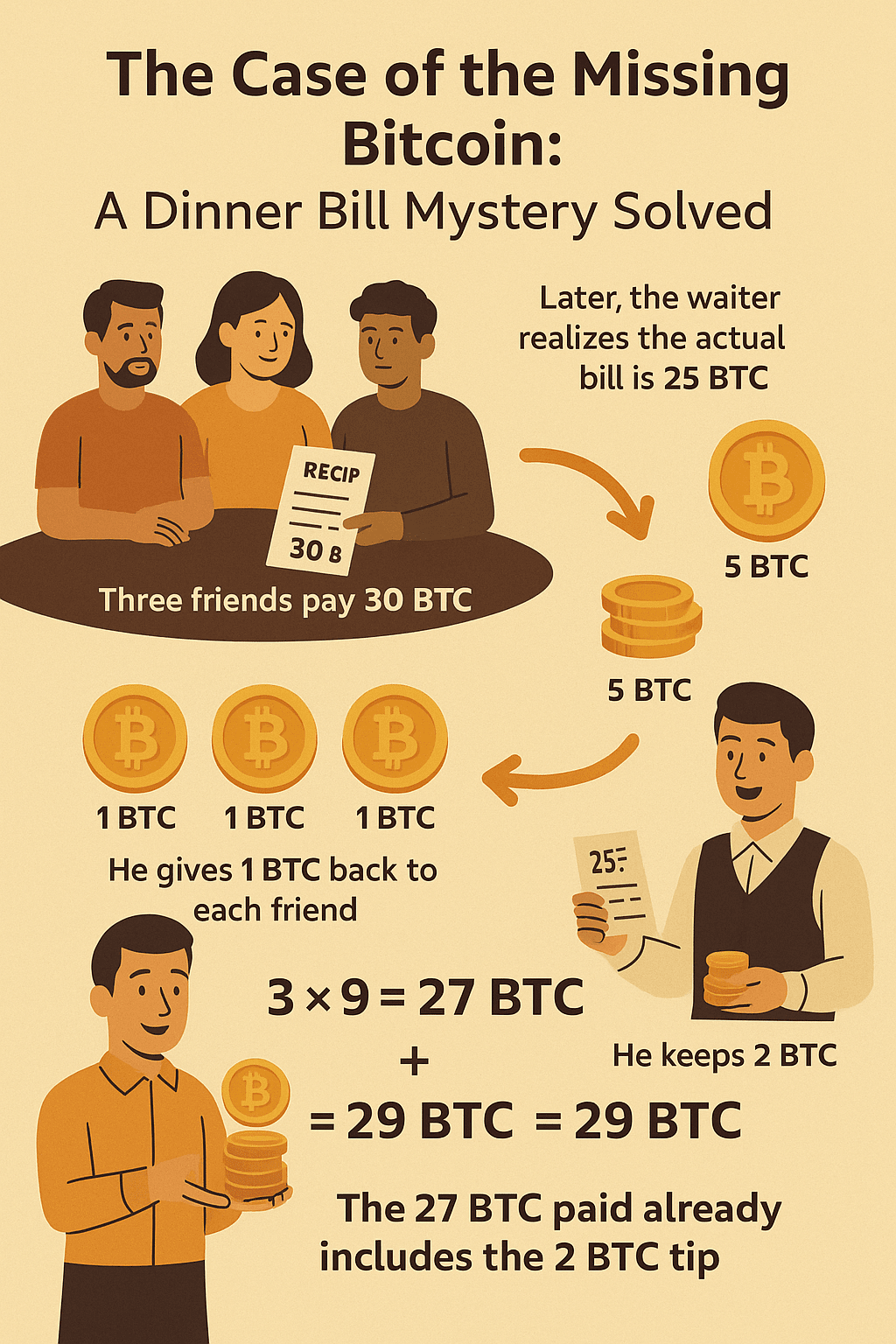 wśród trzech osób stanowił problem. Aby uprościć sprawy, oddał 1 BTC każdemu z gości — zwracając w sumie 3 BTC — a cicho schował pozostałe 2 BTC jako napiwek za swoją uczciwość i obsługę.