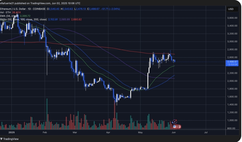 Ethereum aktualnie testuje kluczowy poziom wsparcia na 2500 dolarów amerykańskich, po wielokrotnym osiągnięciu poziomu oporu 2700 dolarów amerykańskich w ciągu ostatnich kilku tygodni. Przebicie tej strefy okazało się trudne, ale byki wciąż trzymają swoje pozycje. Jeśli Ethereum zdoła odzyskać swoje górne pasmo i zamknąć się powyżej, analitycy uważają, że może to zapoczątkować sezon altcoinów, na który rynek czekał.