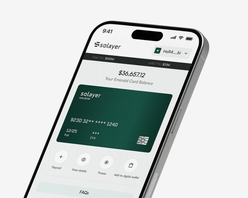 Karta Szmaragdowa to kryptograficzna karta debetowa wydana przez Solayer w oparciu o InfiniSVM, mająca na celu płynne połączenie aktywów on-chain (takich jak USDC) z rzeczywistymi scenariuszami konsumpcyjnymi. Jej kluczowe funkcje i mechanizmy łączenia są następujące: