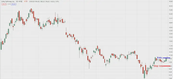Cierpliwie poczekaj, aż cena osiągnie poziom 'najwyższej ceny zamknięcia' od ekstremum rynkowego (tj. powyżej najwyższej knotu świecy), jak pokazano na poniższym rysunku.