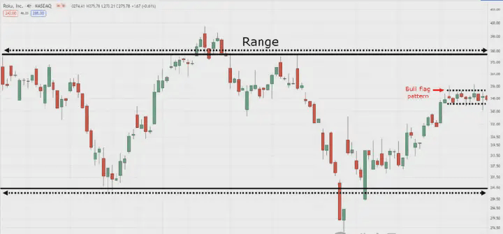 Jednak byłoby idealnie, gdyby istniał sposób na dokładne przewidzenie, kiedy rynek zakresowy zmieni się w trend wzrostowy. Na rynku zakresowym powinieneś cierpliwie czekać, aż cena uformuje wzór flagi byka poniżej poziomu oporu, jak pokazano na poniższym rysunku.