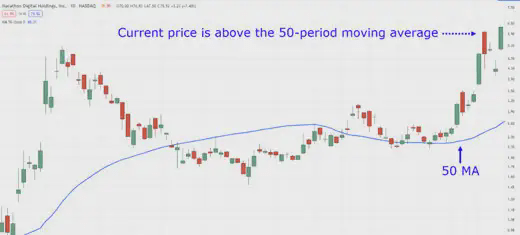 Zakładając, że Twoim celem jest uchwycenie trendu średnioterminowego, zastosujesz 50-okresową średnią ruchomą jako odniesienie. Obecnie oczekujesz, że cena będzie powyżej 50-okresowej średniej ruchomej, jak pokazano na poniższym rysunku.