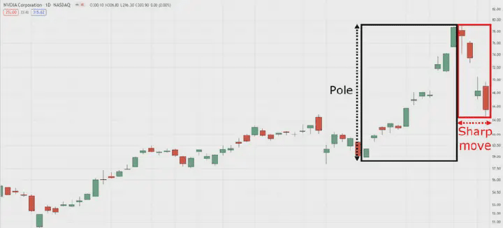(1) Wzór flagi byka składa się z wyraźnego ruchu wzrostowego (tj. ekstremum rynkowego) i serii wahających się wykresów świecowych, które następnie tworzą flagę.