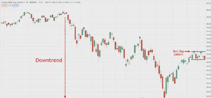 Flaga byka w trendzie spadkowym na dziennym interwale czasowym QQQ