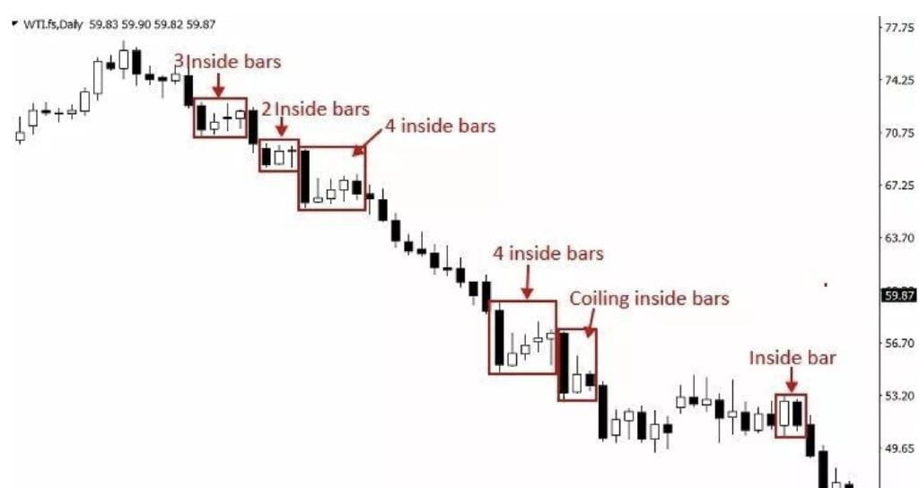 Owijanie inside bar oznacza, że po jednej mother bar występują dwie lub więcej inside bar, które nadal się owijają, a późniejsze inside bar zawsze mieszczą się w zakresie wcześniejszych. Często oznacza to, że rynek może przygotowywać się do wielkiej zmiany.