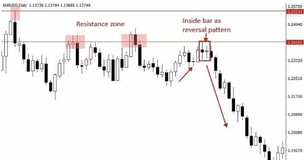 Czasami inside bar jest sygnałem odwrócenia, co oznacza, że cena waha się na pewnym poziomie, a następnie zaczyna się korekta w innym kierunku.