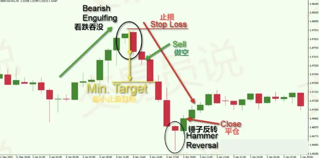 Tę transakcję można rozszerzyć, aby uzyskać dalsze zyski. Możesz użyć reguł price action, aby określić ostateczny sygnał wyjścia. Zauważysz, że kurs GBP/USD utworzył na wykresie dwie kolejne duże niedźwiedzie świece, co podwoiłoby zysk z transakcji. Jednak następna świeca na wykresie to formacja odwrócenia młota, znana również jako pin bar, która ma silny potencjał wzrostowy. Transakcja powinna zostać zamknięta po potwierdzeniu formacji młota. Jak widać, następna świeca jest bycza i przebija górny poziom formacji młota. Potwierdza to ważność formacji odwrócenia młota i generuje sygnał wyjścia, aby zamknąć krótką pozycję. Transakcja niedźwiedziego objęcia powinna zostać zamknięta po zamknięciu byczej świecy następującej po formacji młota, jak pokazano drugą czerwoną strzałką na powyższym obrazku.