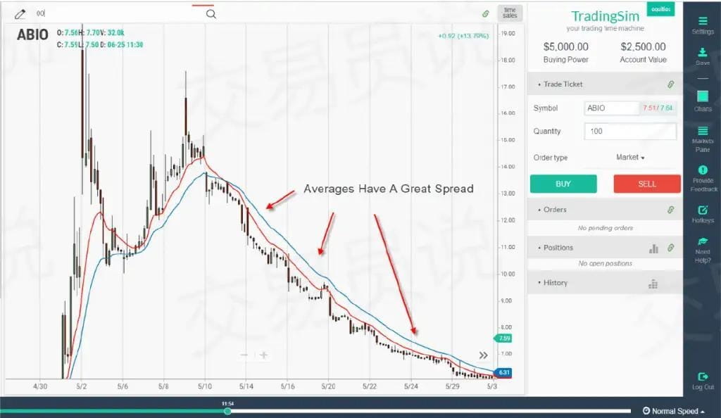 Powyższy wykres wyraźnie pokazuje silny spadek ceny akcji. Zauważ, że średnie kroczące nie przecinały się ani razu podczas spadku. Aby wzmocnić wiarygodność trendu, średnie kroczące utrzymywały dużą lukę przez cały okres spadku.