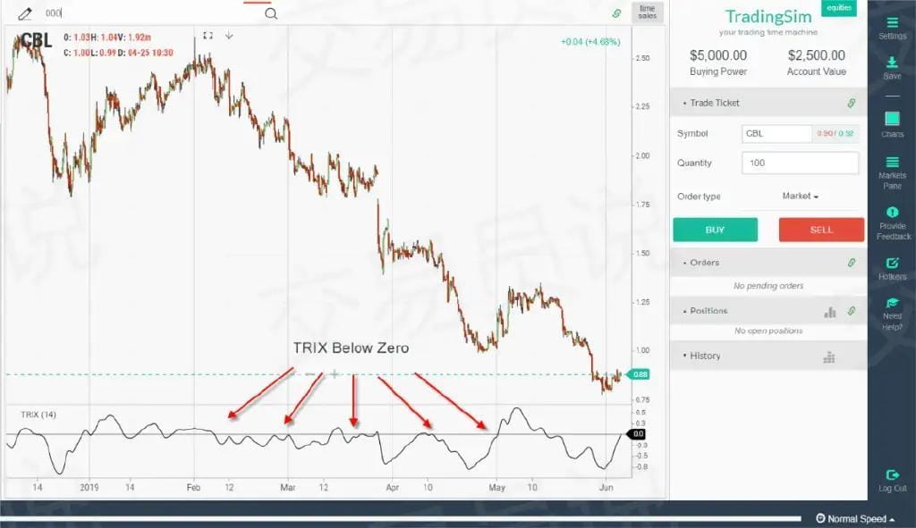 Wskaźnik TRIX (Triple Smoothed Average Exponential) to oscylator momentum, który waha się powyżej i poniżej linii zerowej. Na następnym wykresie omówimy akcje znajdujące się w silnym trendzie spadkowym.