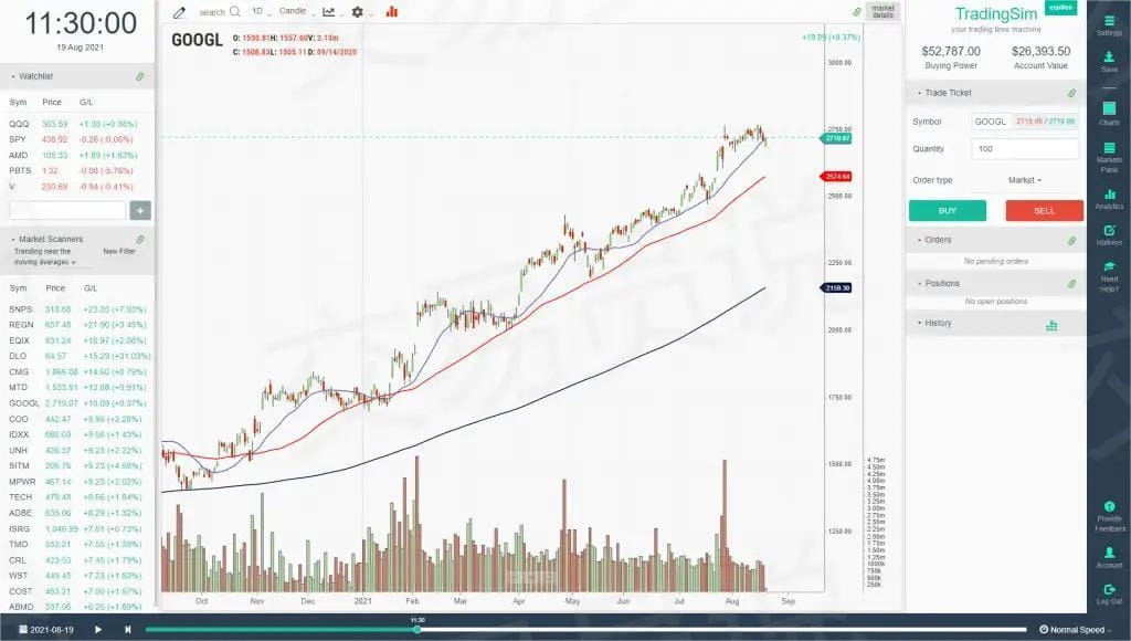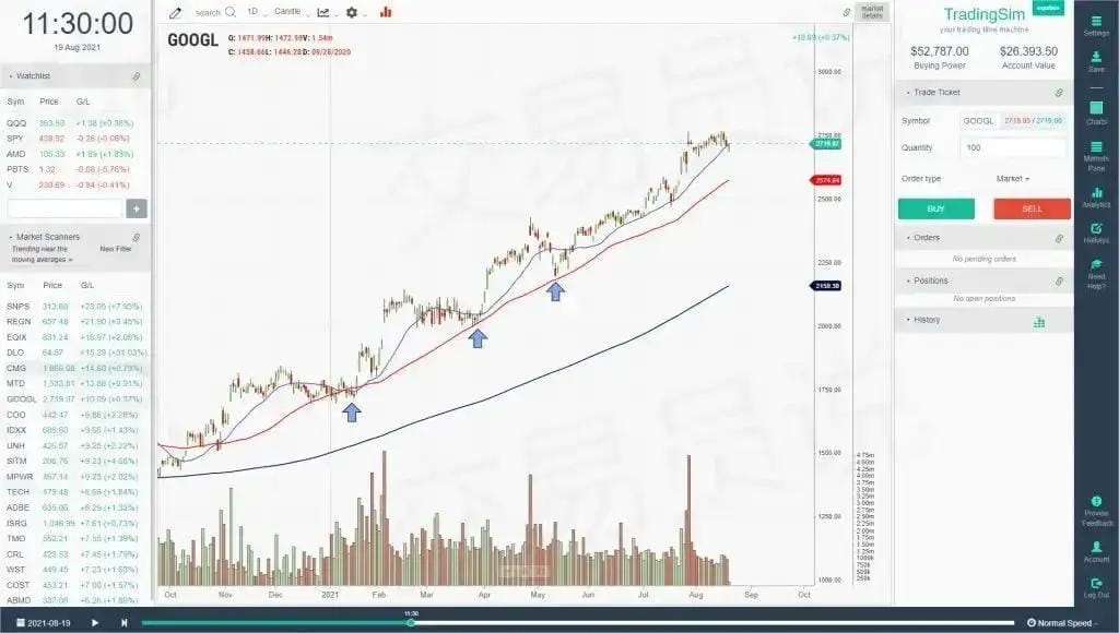 Skorzystajmy z powyższego przykładu GOOGL, aby przekonać się, dlaczego kupno akcji w pobliżu 50-dniowej średniej kroczącej było doskonałą decyzją.
