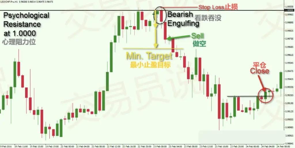 Powyższy wykres przedstawia godzinowy wykres pary USD/CHF (dolar amerykański/frank szwajcarski) od 19 do 24 lutego 2016 r. Wykres pokazuje kolejną niedźwiedzią transakcję pochłaniającą, która miała miejsce po tym, jak cena przekroczyła poziom psychologicznego oporu.
